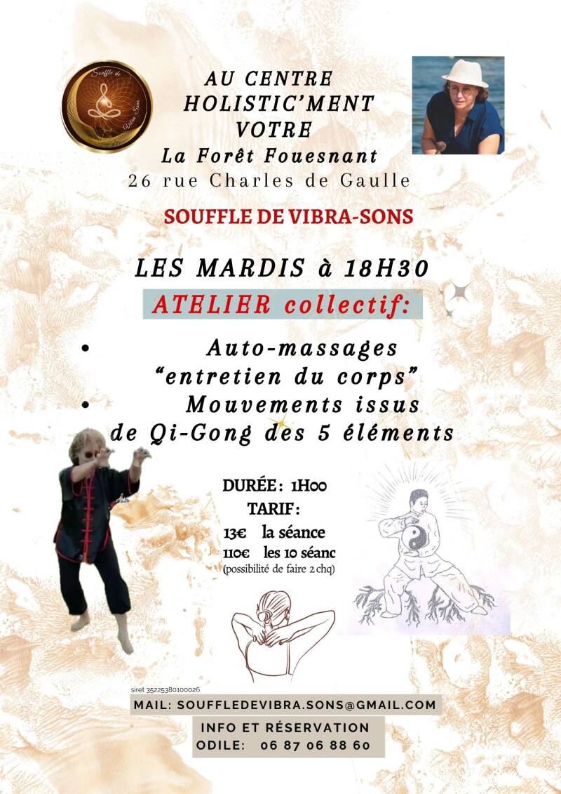 Les mouvements simples et doux issus de qi-gong viennent agir sur l’organe correspondant à la saison et/ou l’inter-saison (selon la MTC), sur les méridiens et la remise en circulation de vos différents flux (l’énergie vitale appelée QI, le sang, la lymphe), mais aussi sur l’assouplissement des articulations, l’équilibre, l’harmonie intérieure en respectant le rythme et les possibilités de chacun dans le respect et la bienveillance.